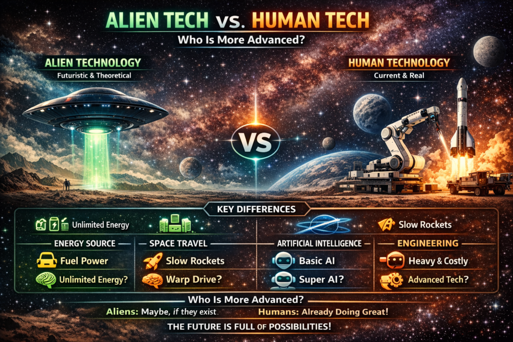 Explore the key differences between alien technology and human technology in a simple way.